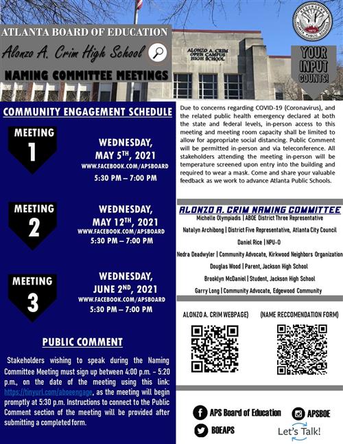 The Atlanta Board of Education is considering a name change for Alonzo A . Crim High School. We would appreciate input from the past, present, and future school community. On April 12, 2021, Chairman Jason Esteves appointed a special committee to consider nominations and make a recommendation to the board for approval.