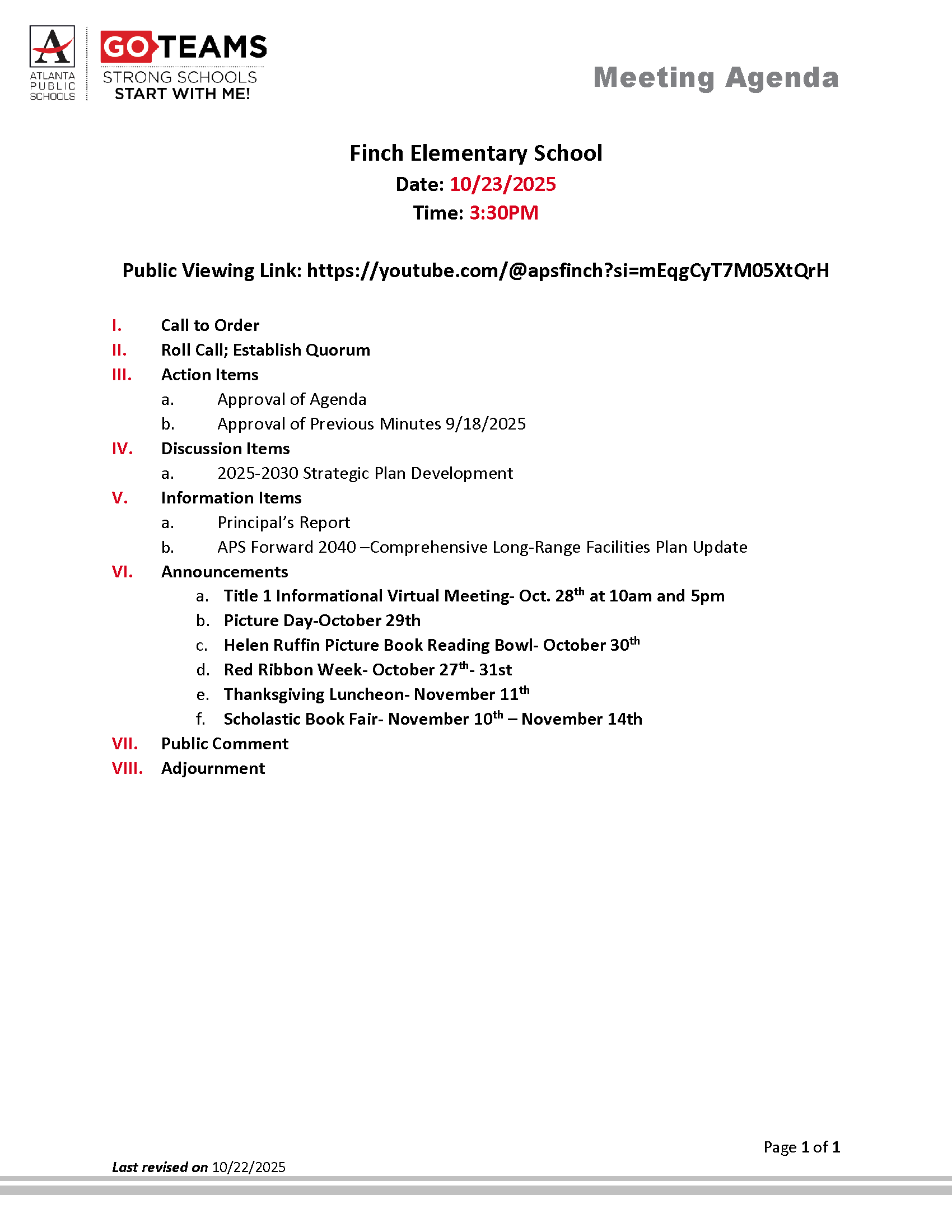 Name Officer or Representative Position Role Email Address Tara Spencer Principal tara.spencer@atlanta.k12.ga.us Kashon Caldwell Parent/Guardian kashoncaldwell@yahoo.com Edwina Lawrence Cluster Representative Parent/Guardian eilawrence@outlook.com Jasmina King Parent/Guardian JasminaV.King@gmail.com Erin Gore Co-Chair Instructional Staff erin.gore@atlanta.k12.ga.us Tatyana McKnight Instructional Staff tatyana.mcknight@atlanta.k12.ga.us Germain Tesia Chair Instructional Staff tesia.german@atlanta.k12.ga.us Eric Thomas Community Member evthomas14@icloud.com Terence Lester Community Member tlester@lovebeyondwalls.org Rekina LeCount Secretary Swing Seat rlecount@atlantak12.ga.us Meeting Schedule