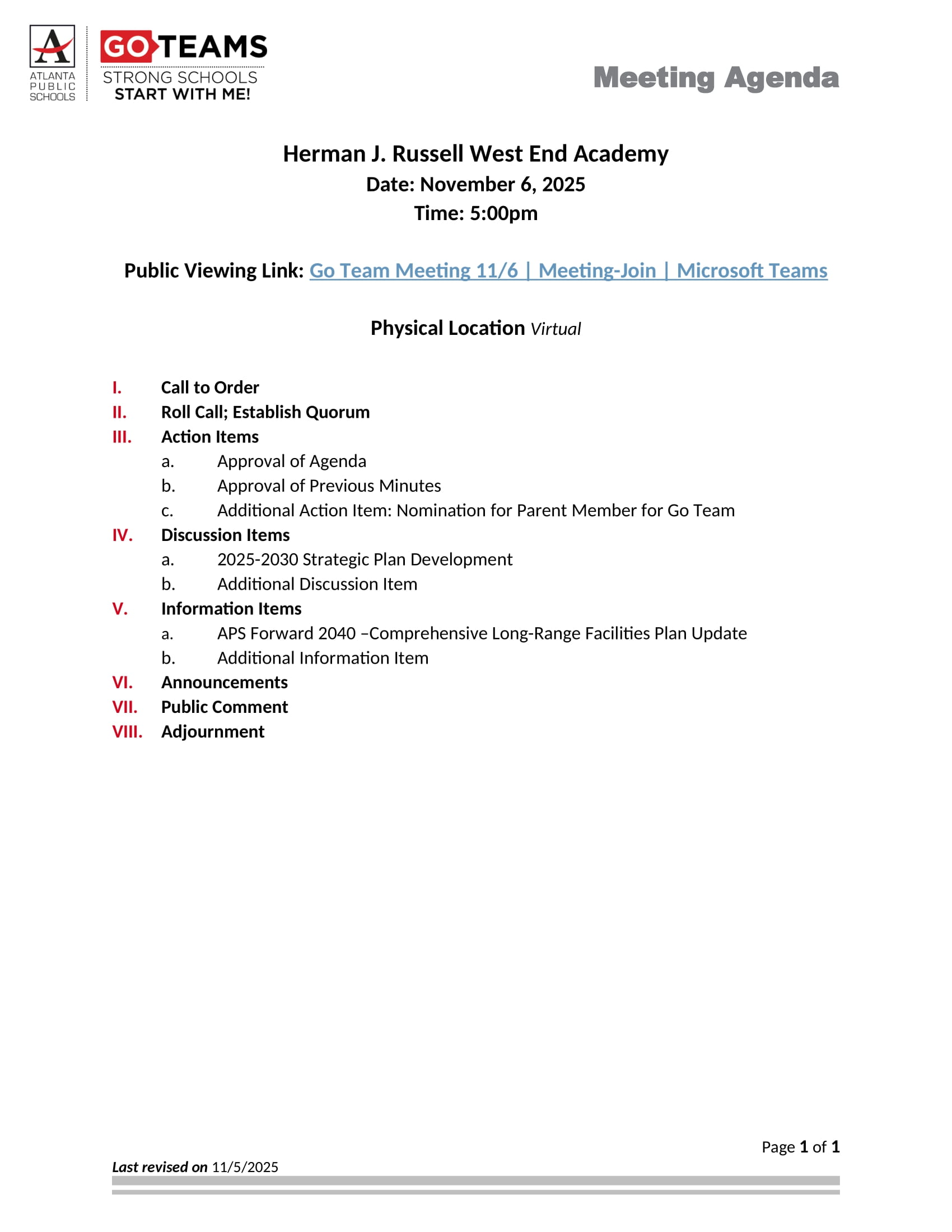 Meeting Date Meeting Time Time Allotted for Public Comment (Yes or No) Link to view virtually (required) & Location if hybrid Meeting Agenda Meeting Summary or Draft Minutes Meeting Recording Presentation & Meeting Documents Approved Minutes 9/4/2025 5pm No Click HERE to join meeting Agenda Meeting Minutes09042025 10/9/2025 5pm Yes Click here to join MS Teams Go Team Agenda 1092025 GO Team Presentation 11/6/2025 5pm Yes Click here to join MS Teams 11052025 Go Team Agenda 2025/2026 HJR Strategic Plan 12/4/2025 5pm Yes 1/29/2026 5pm Yes 2/12/2026 5pm Yes 3/5/2026 5pm Yes Public Comment Protocol